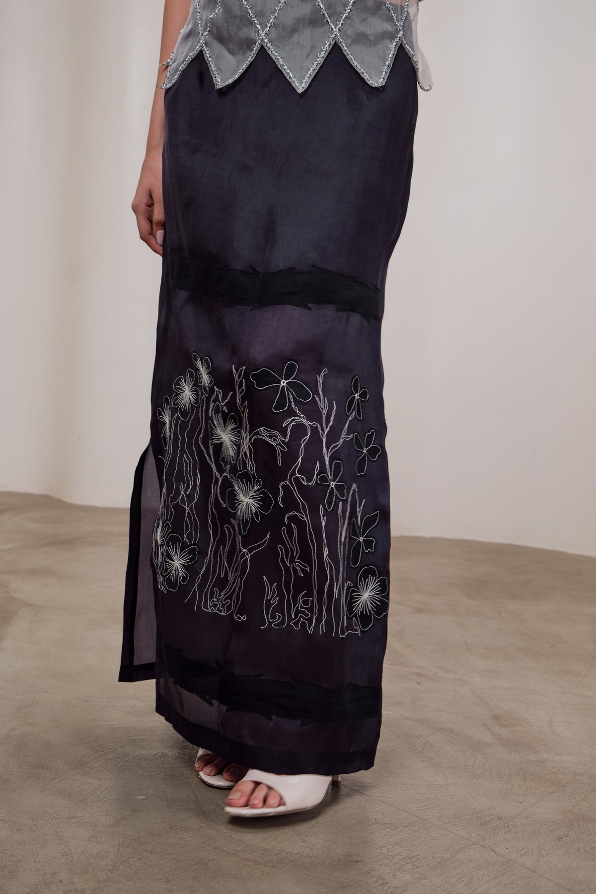 The Drift Skirt, crafted in airy silk organza, features a fluid, elongated silhouette that moves with effortless grace. Designed in deep, moody tones, the skirt is enhanced with delicate floral line embroidery along the hem, adding subtle artistry and depth. Its sheer layering and soft structure create a refined balance of lightness and elegance, making it a versatile piece for contemporary occasion wear and elevated evening styling.