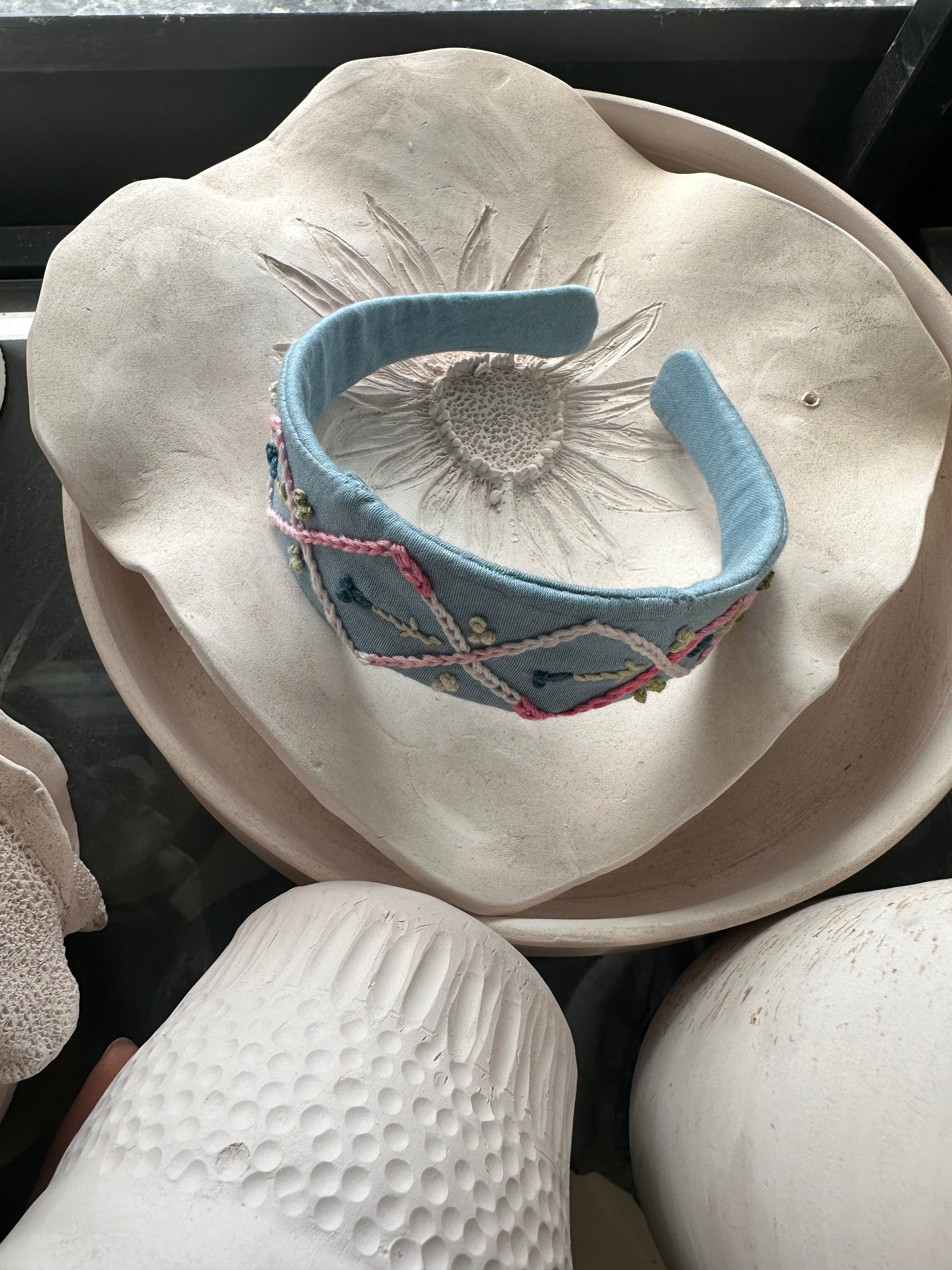 Introducing "icy petal blush": A hairband with an icy blue background and soft pink embroidery. The blend of cool and warm hues creates a captivating accessory that adds a touch of elegance to any look.