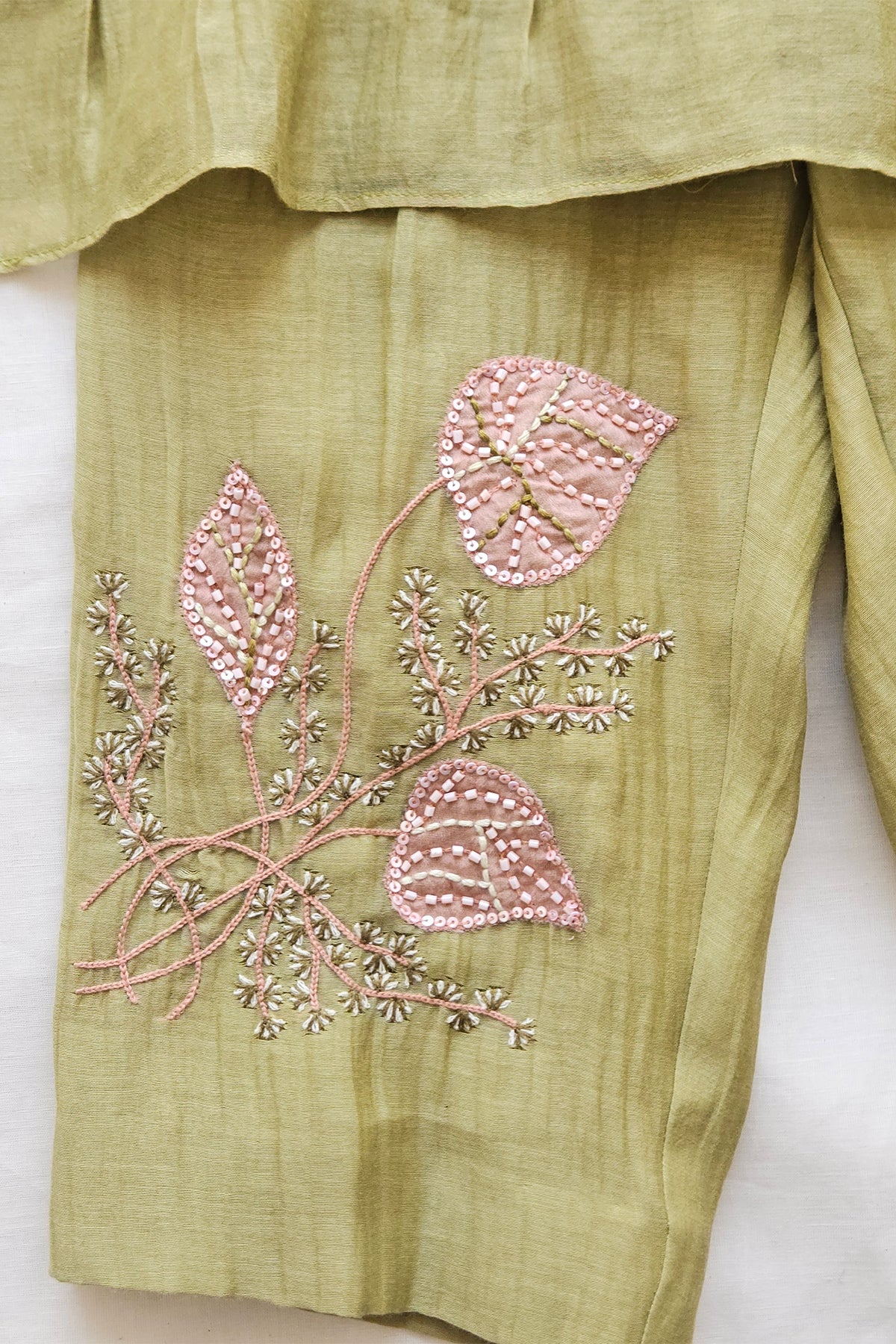 Crafted in airy Chanderi, the Verdant Bloom Set features a soft sage-green palette with delicate floral embroidery across the top and coordinated trousers. Subtle bead detailing adds a refined finish, while the clean silhouette keeps the look contemporary. Lightweight, breathable, and thoughtfully designed, this set offers effortless elegance for special occasions and elevated everyday wear.