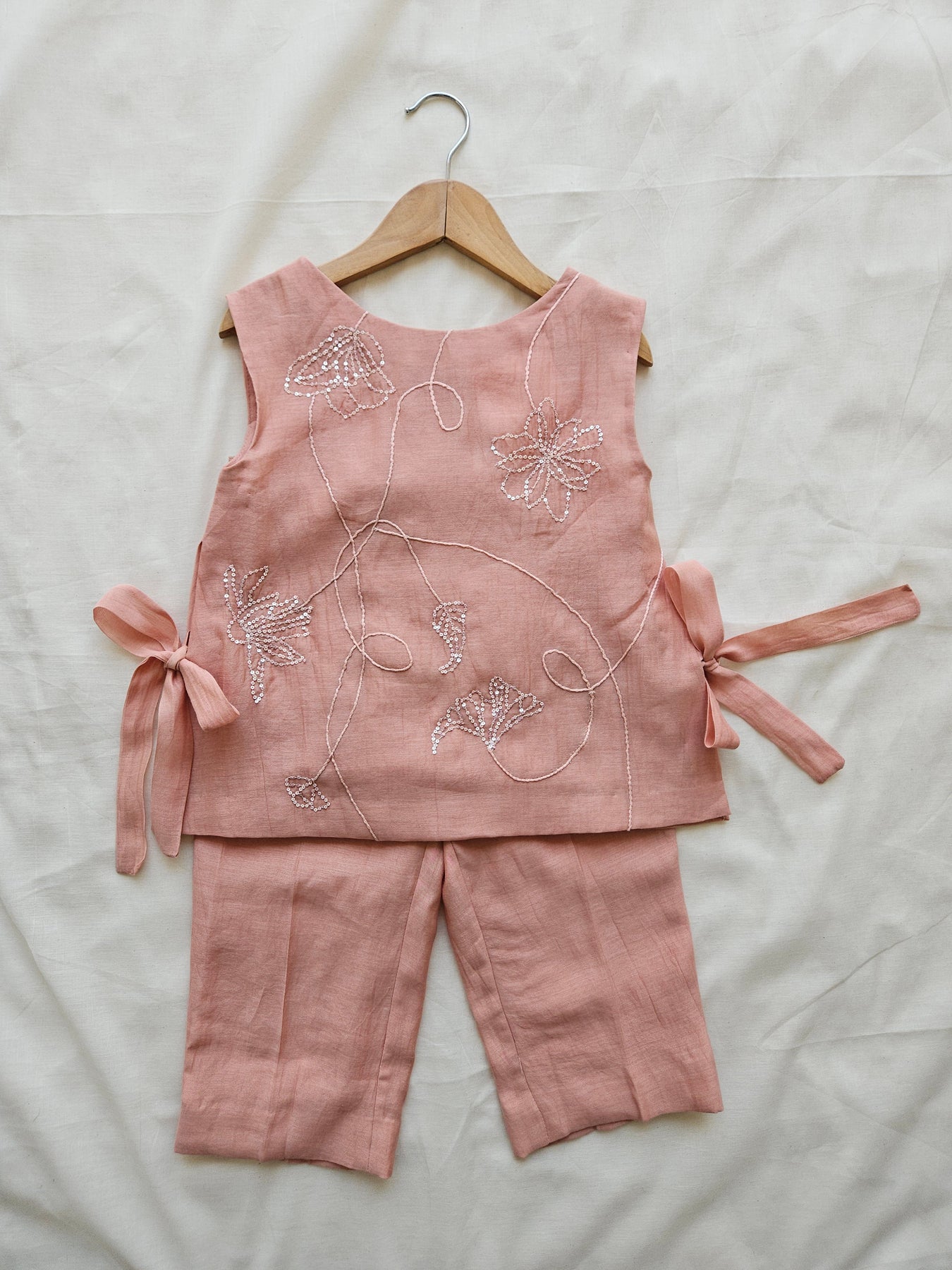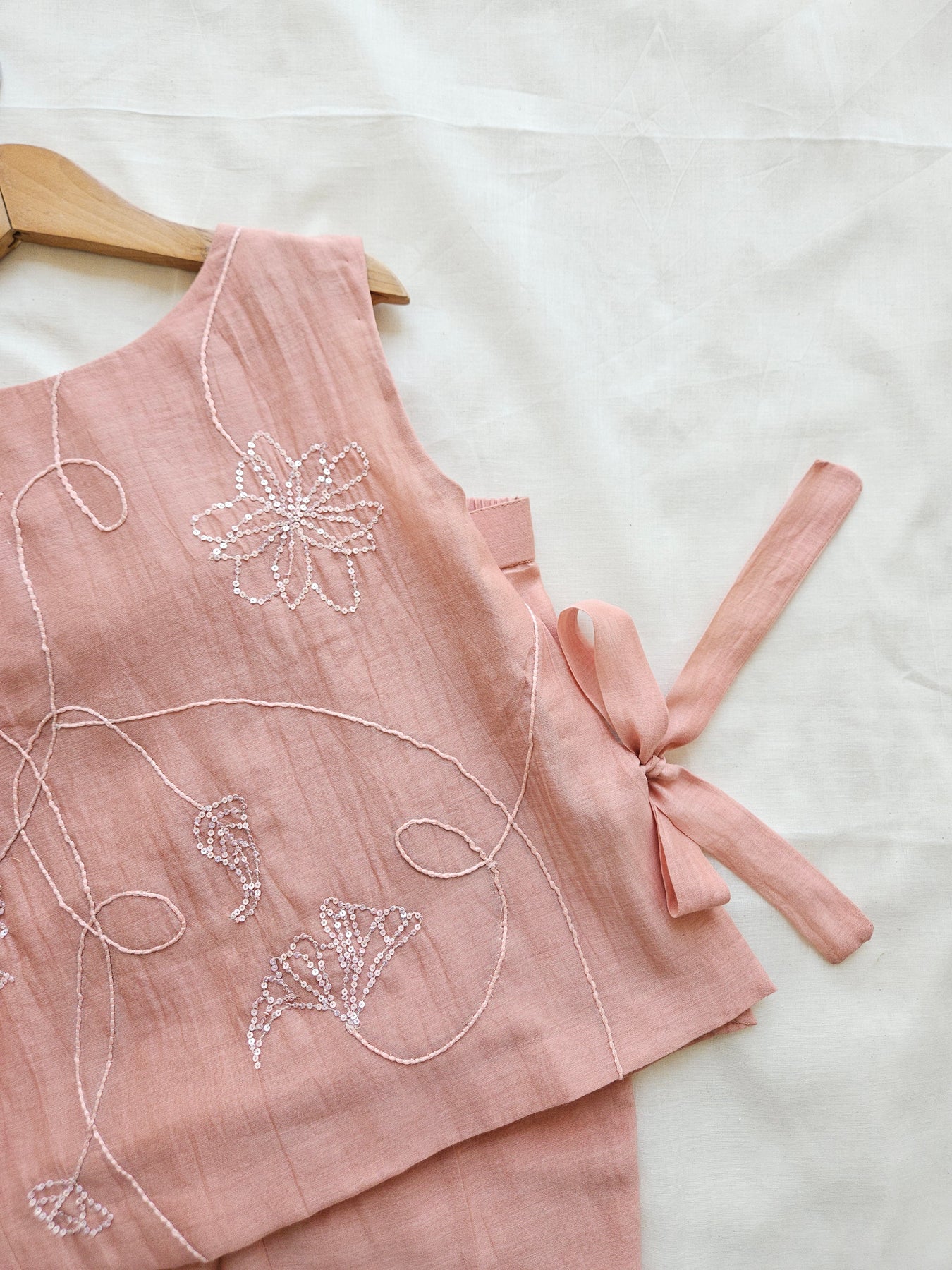 Linéa Bloom Set is crafted in airy Chanderi, featuring a soft blush base elevated with delicate line-art floral embroidery finished in subtle sequin detailing. The fluid stitchwork creates an abstract, hand-drawn effect, adding a refined artistic touch to the clean silhouette. Lightweight, breathable, and thoughtfully constructed, this set offers understated luxury with effortless comfort—ideal for special occasions and elevated everyday moments.