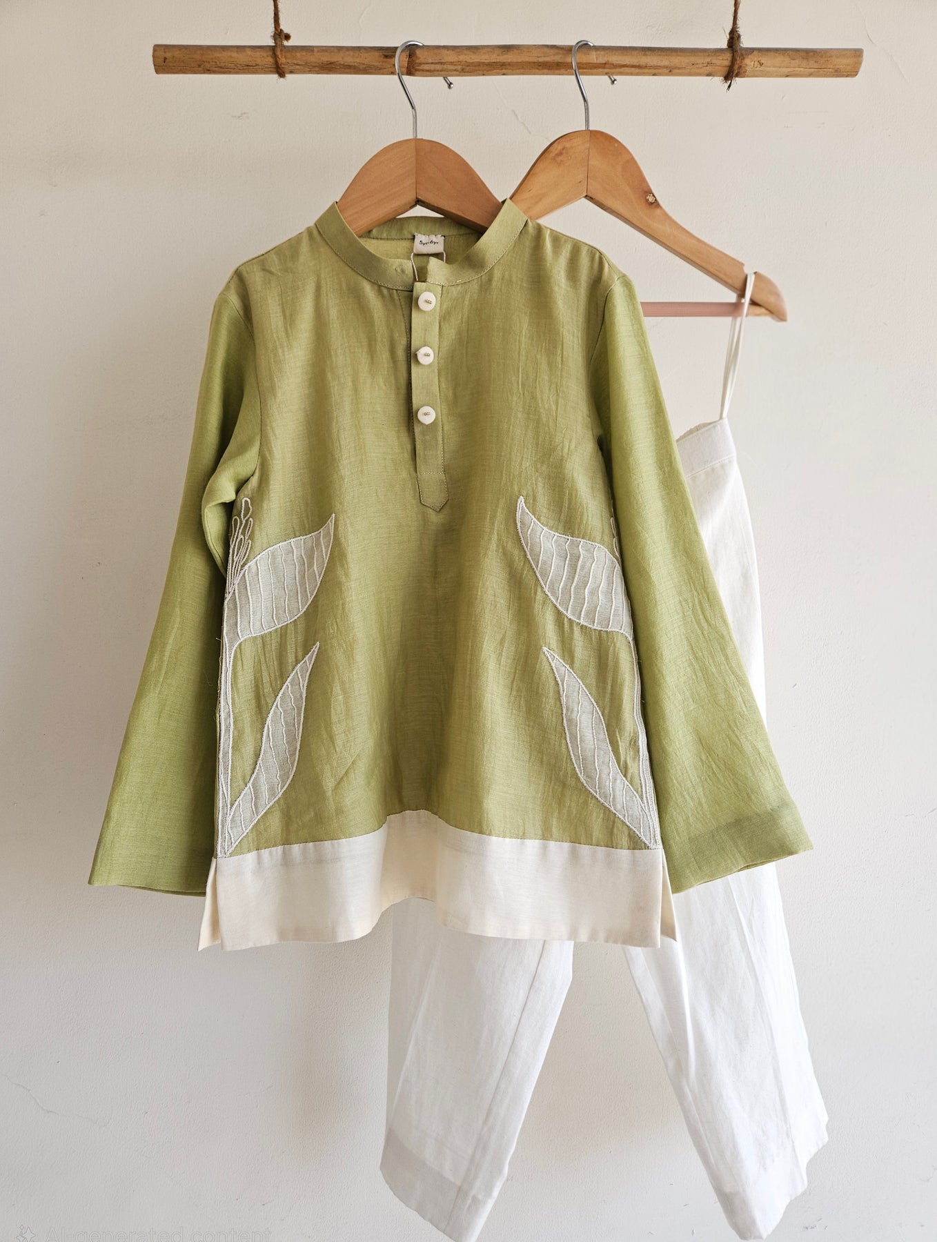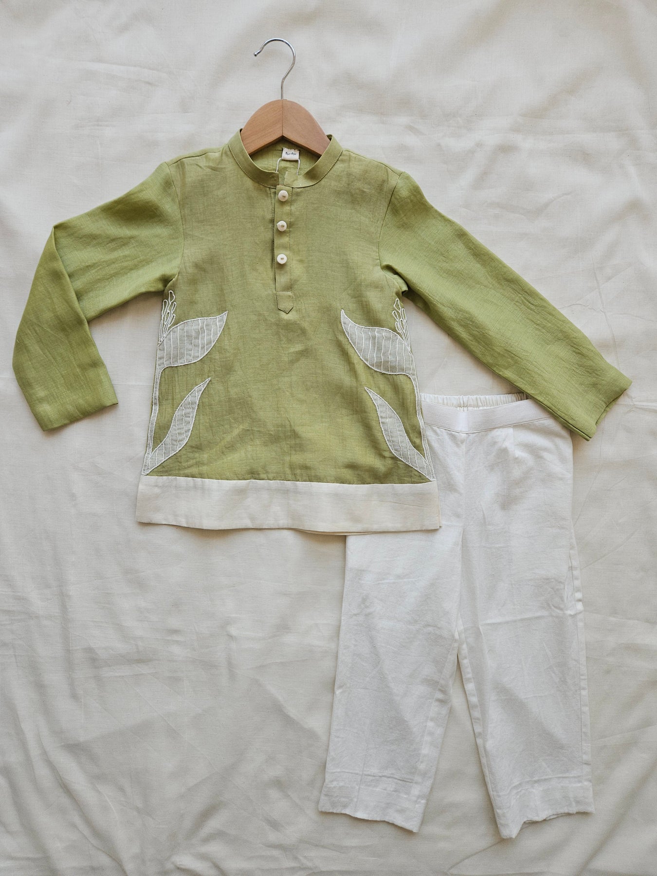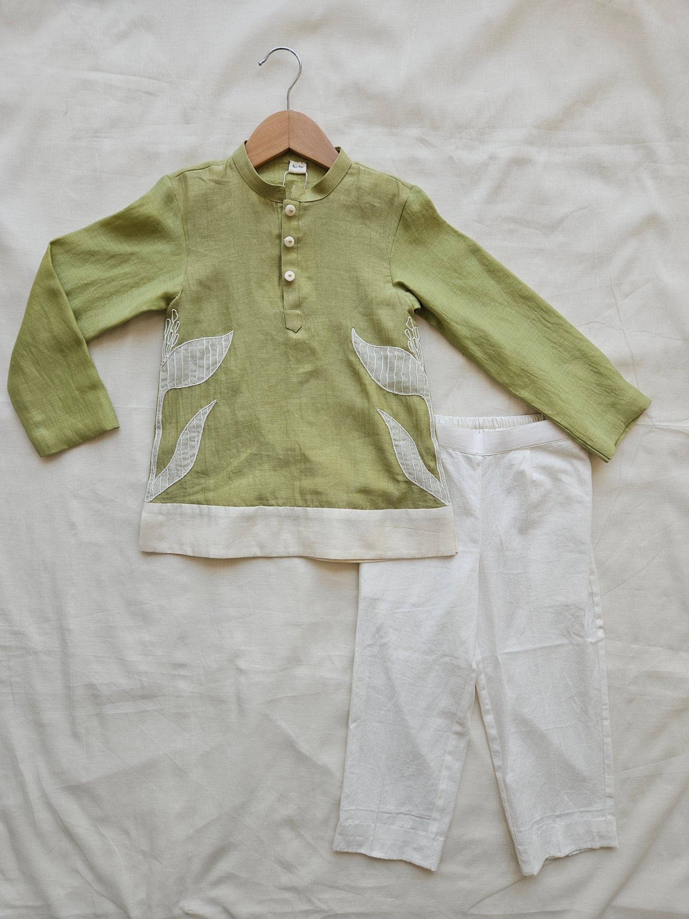 This olive-green Chanderi kurta set is designed with a timeless silhouette and thoughtful detailing. The kurta features delicate ivory leaf appliqué along the sides, adding a soft, nature-inspired accent to the minimal design. Finished with a neat mandarin collar and natural buttons, it pairs effortlessly with crisp ivory bottoms for a balanced, refined look. Lightweight, breathable, and comfortable, this set is ideal for festive celebrations, family gatherings, and special occasions where tradition meets ease.