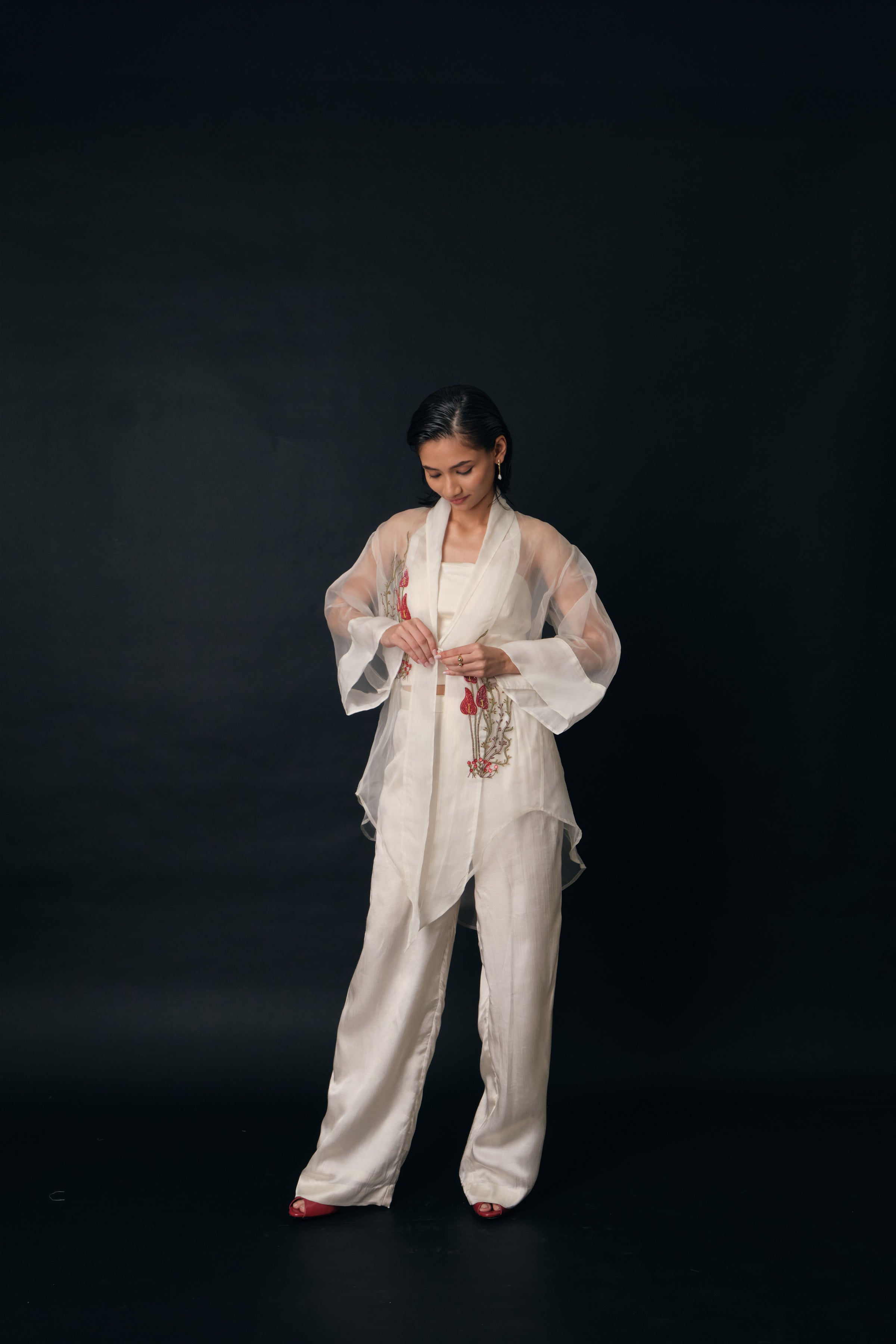 Red chanderi silk hand embroidered layered jacket set