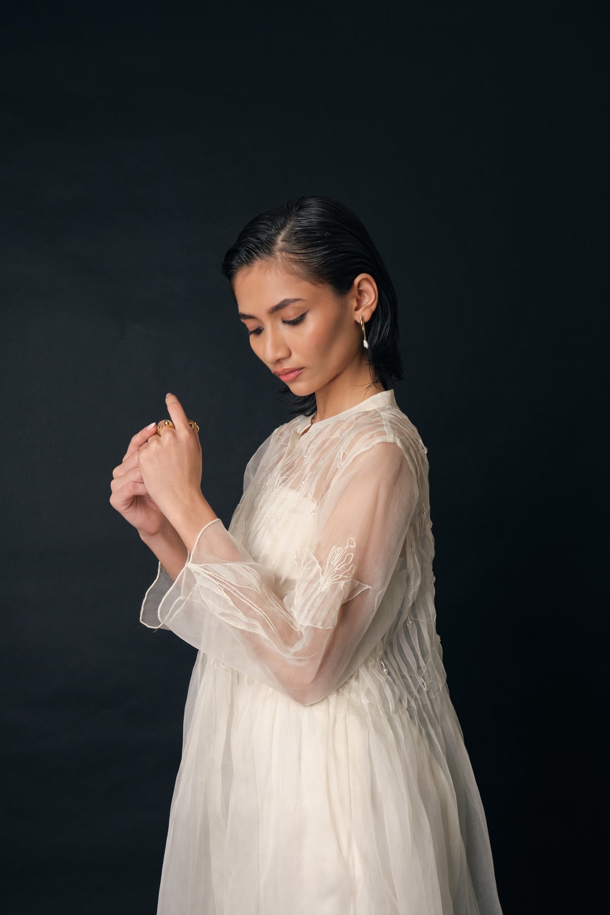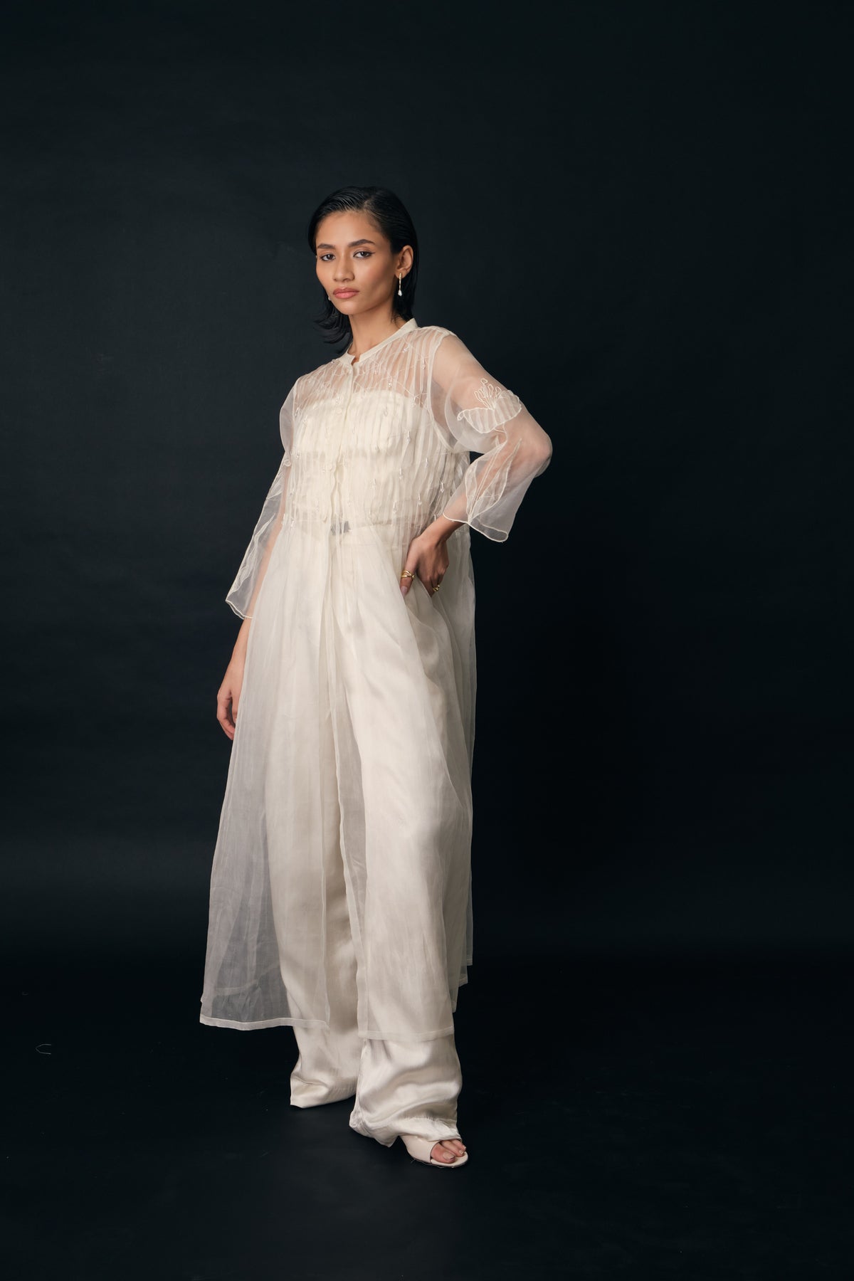 The Opaline Jacket, crafted in sheer silk organza, exudes soft elegance with its translucent layers and fluid drape. Designed with a gentle A-line silhouette and a refined round neckline, the jacket features delicately detailed sleeves highlighted with fine handwork that adds subtle texture and artisanal charm. Its ethereal finish and graceful movement make it a versatile layering piece, perfect for elevating dresses or coordinated separates with modern sophistication and timeless allure.