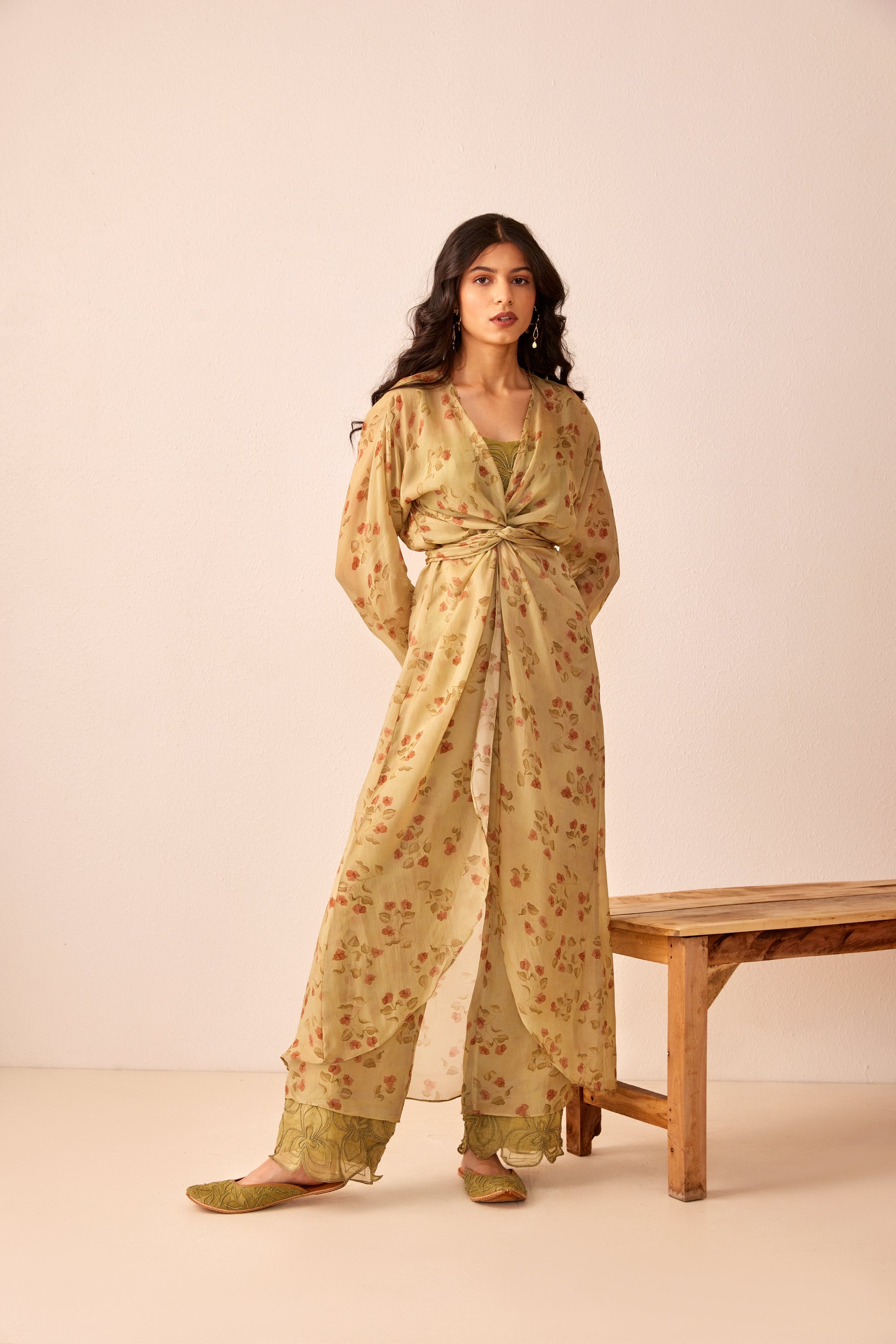 Give your festive look a fusion update with this green printed paper silk three pc set. Printed with a deep bougainvillea foliage, hand embroidered with bead work.The jacket comes with a tie up detail at the waist. It comes with an embroidered crop top and embroidered hem at the trousers. Style this set with a pair of matching juttis with layered necklaces.