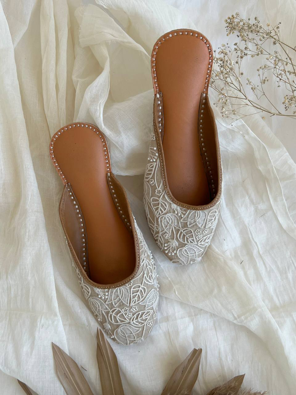 Thea beige hand embroidered juttis with white thread work on cotton chanderi fabric, the juttis are cushioned for comfort and long hour of work