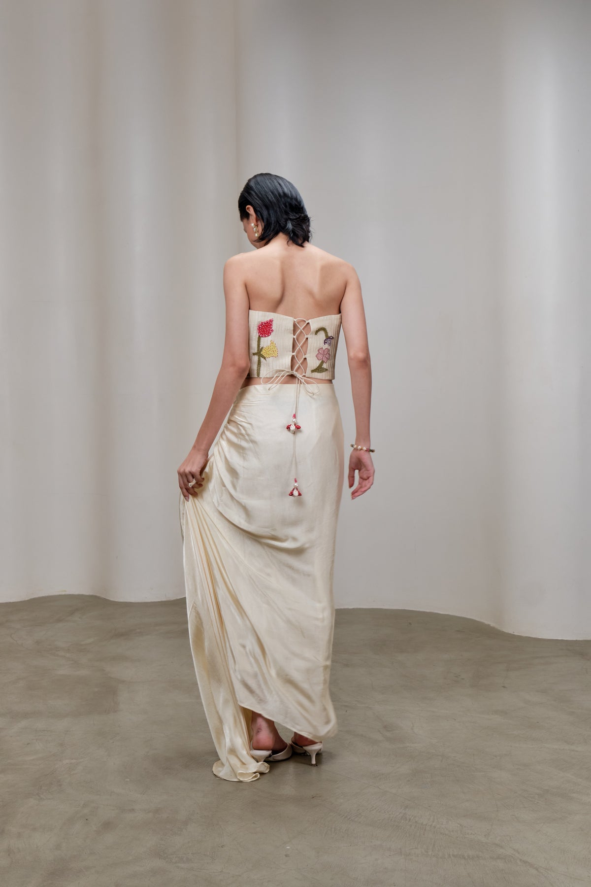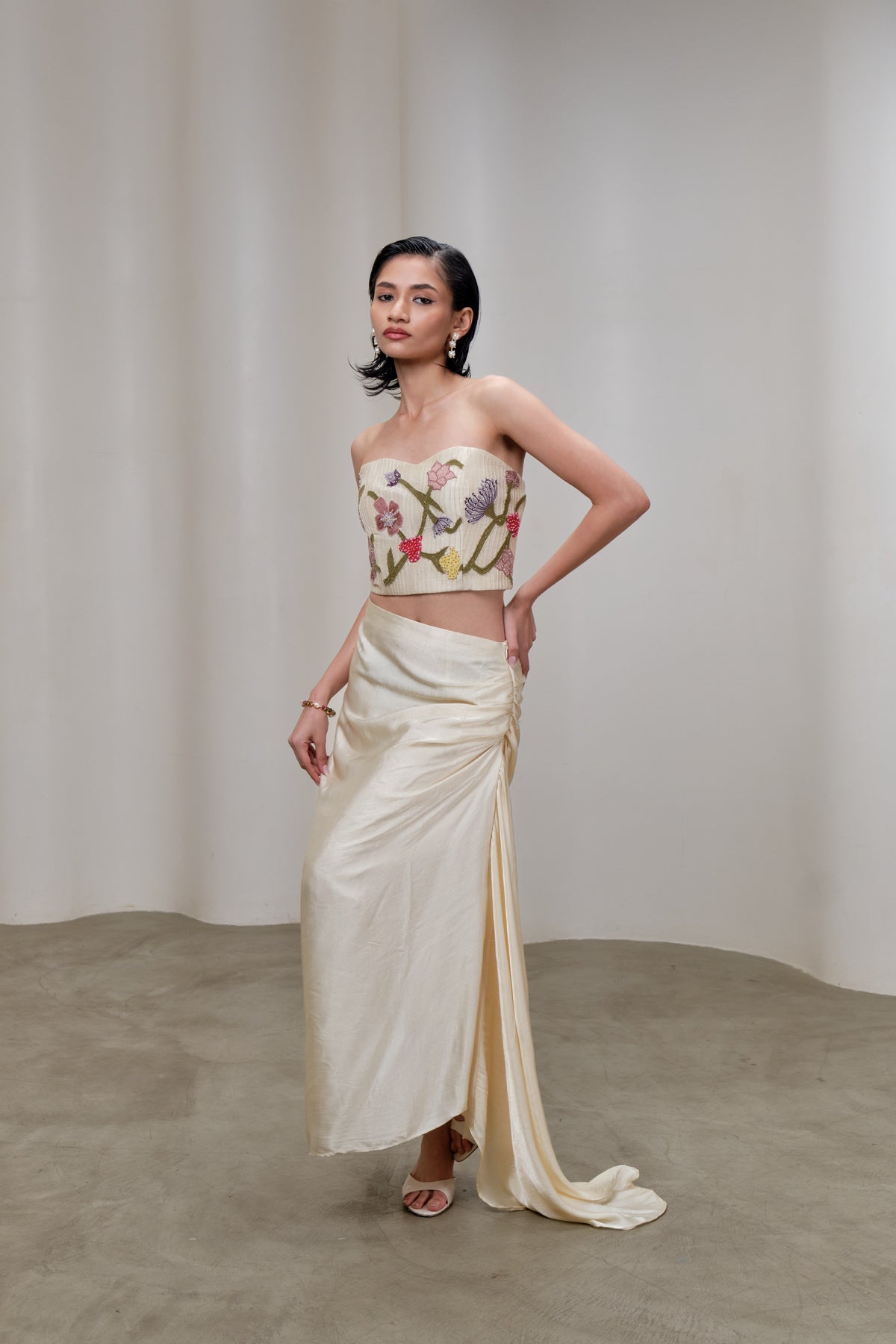In a refined butter cream shade, this draped skirt is crafted in fluid satin that falls effortlessly along the form. Side gathers create a cascading panel that adds movement and sculptural elegance, while the elongating silhouette offers a graceful, sophisticated finish. Perfect for elevated occasions and modern festive styling.