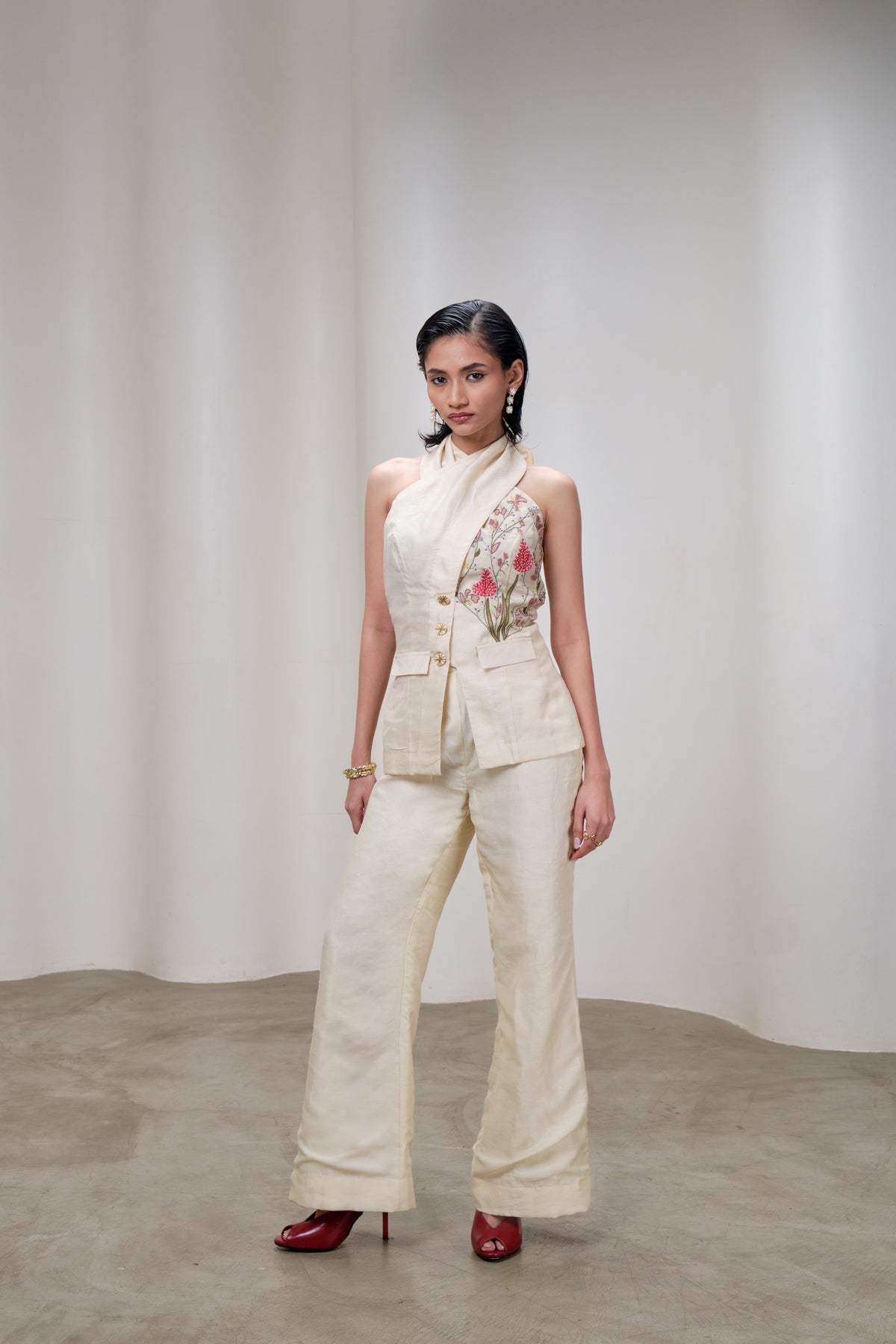 These flat silk boot-cut pants are tailored for effortless sophistication, featuring a smooth, lustrous finish that enhances their fluid movement. The mid-rise fit gently skims the body before subtly flaring toward the hem, creating an elongated, balanced silhouette. Lightweight and refined, they transition seamlessly from polished daywear to elevated evening looks, pairing beautifully with structured tops, draped blouses, or coordinated corsets.