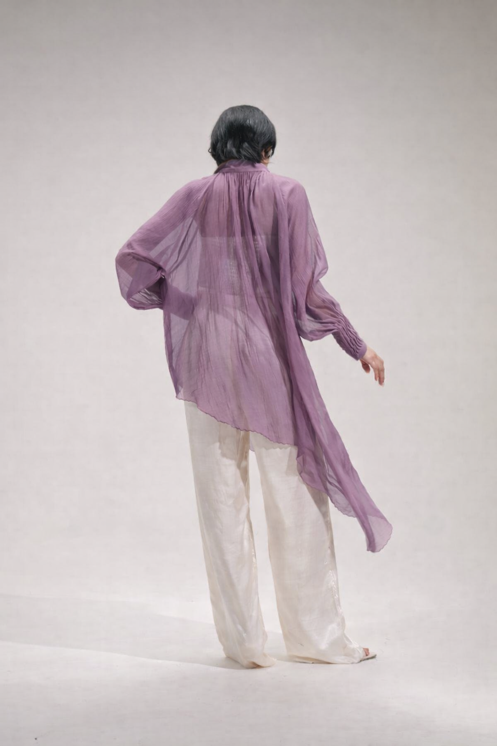 The Still Noir Shirt is crafted from lightweight chanderi, offering a delicate translucence and graceful drape. Designed with an asymmetrical hemline and relaxed silhouette, it features intricate floral embroidery that adds a touch of artisanal detail to the flowing form. Buttoned through the front with a classic collar, the shirt blends timeless elegance with contemporary ease—perfect for layering over trousers or skirts for an effortlessly sophisticated look.