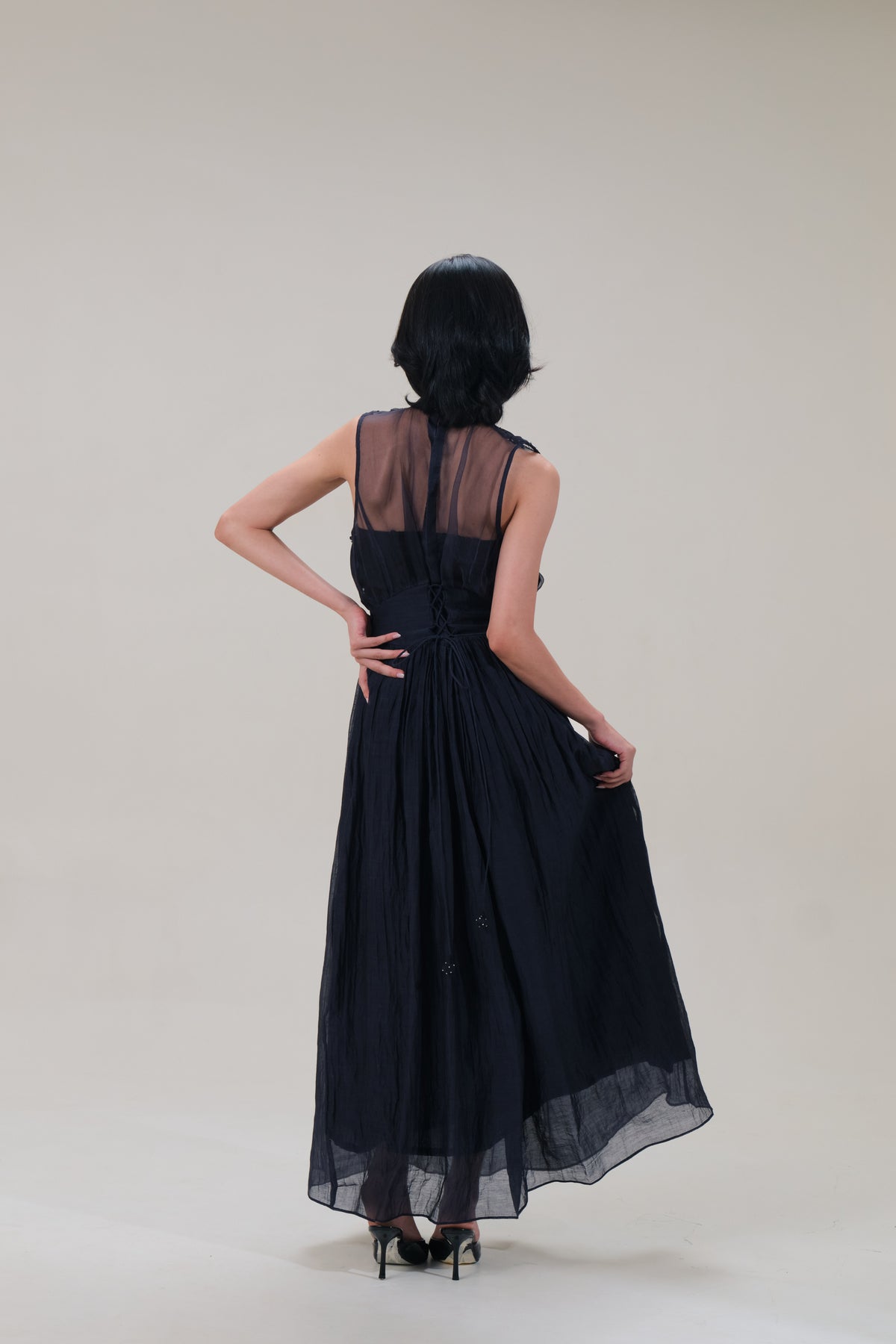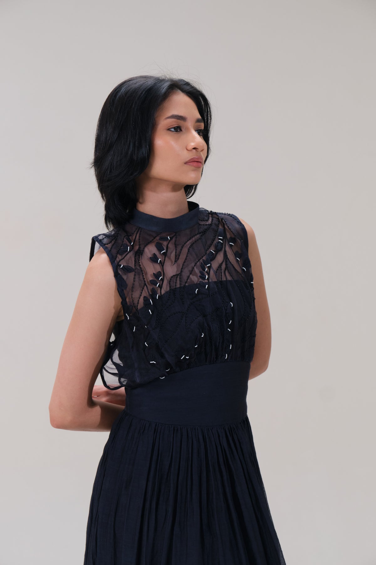 Ethereal, graceful, and undeniably captivating—the Moonlit Dress is designed to make every moment feel enchanting. Crafted from delicate organza, this dress blends sheer artistry with flowing elegance. The bodice features a beautifully embroidered sheer panel, adorned with soft leaf motifs that create a dreamy, nature-inspired look. Its sleeveless design and high neckline add a modern, sophisticated touch, while the solid waistband shapes the silhouette with subtle definition. Falling into a long, fluid skirt, the organza fabric moves weightlessly, giving the dress an effortless, moonlit shimmer with every step. Perfect for evening soirées, festive celebrations, or intimate gatherings, the Moonlit Dress is your timeless statement piece for refined occasion.
