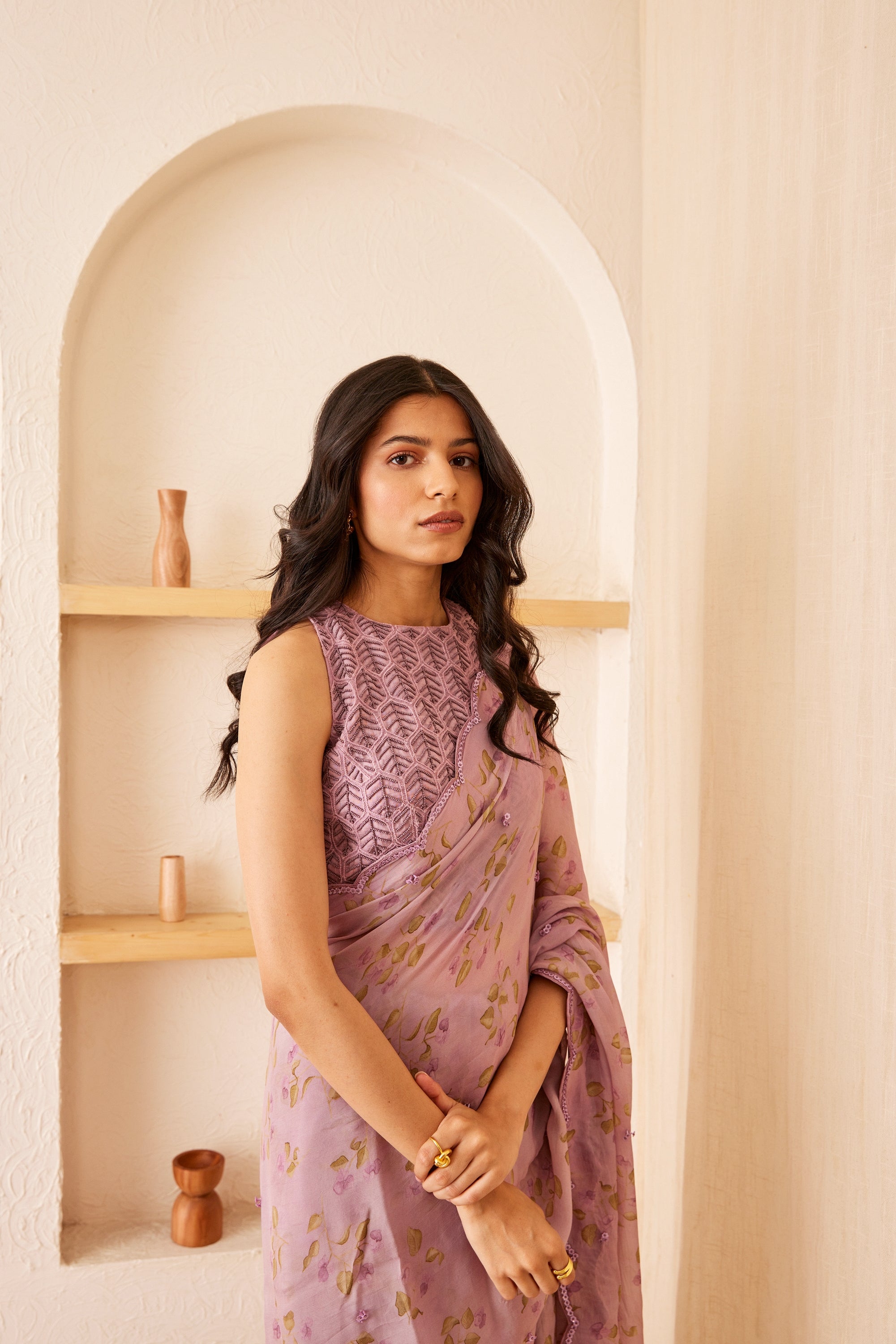 Take on the festive season in style with this charming lavender blouse in fine chanderi. It is designed with hand embroidered botanical applique with bead embellishments.