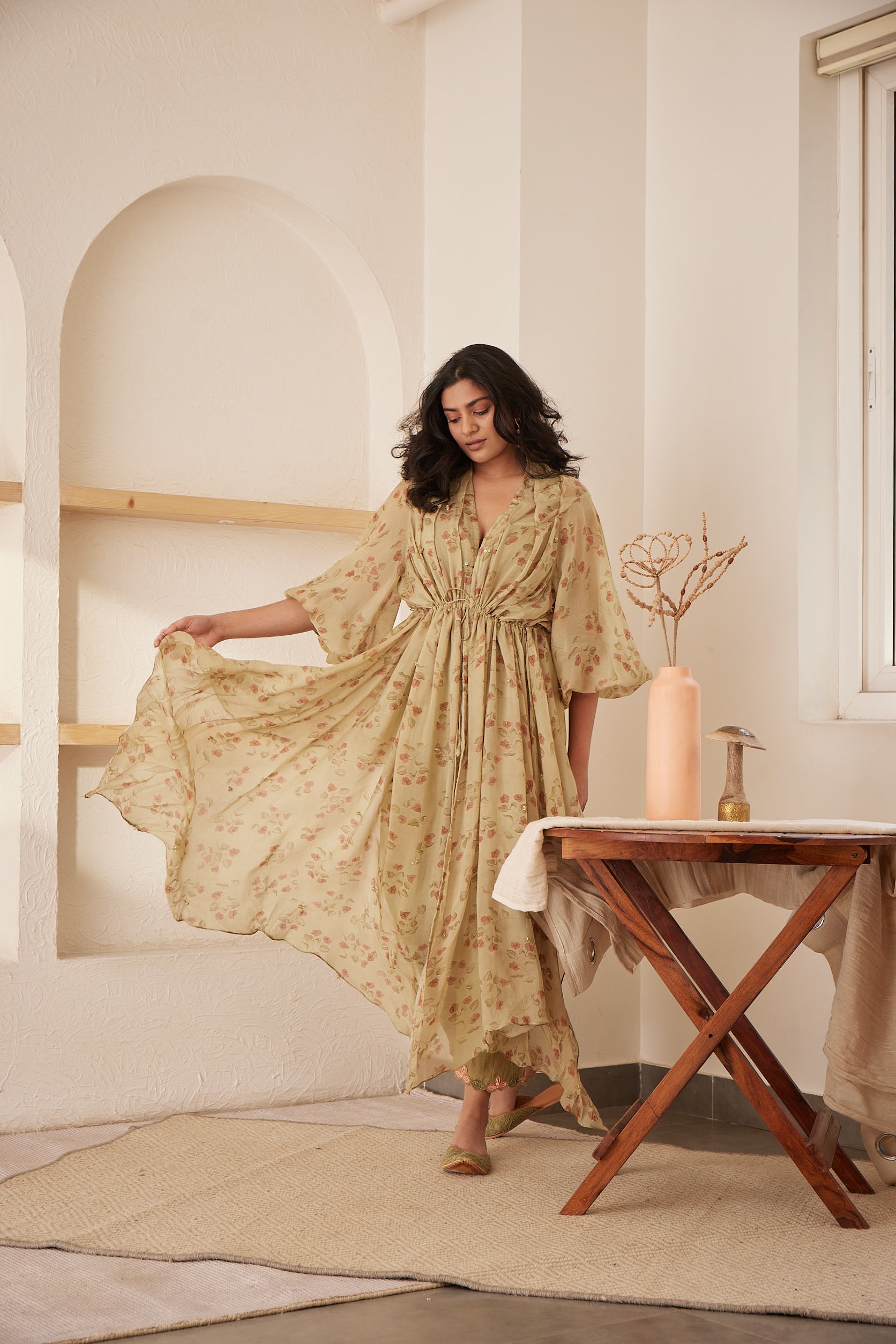 easy to wear and oh so easy to style, this green printed overlay is a must-have for the season of festive soirees. Tailored in paper silk with a high low silhouette, and puttlout drawstring features gathers on waist the coordinated pants are tailored straight fit. Style this look with our matching hand-embroidered mojdis and delicate earrings.